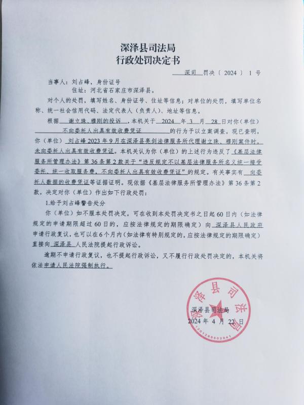 深泽县司法局行政处罚决定书 深司罚决〔2024〕1号