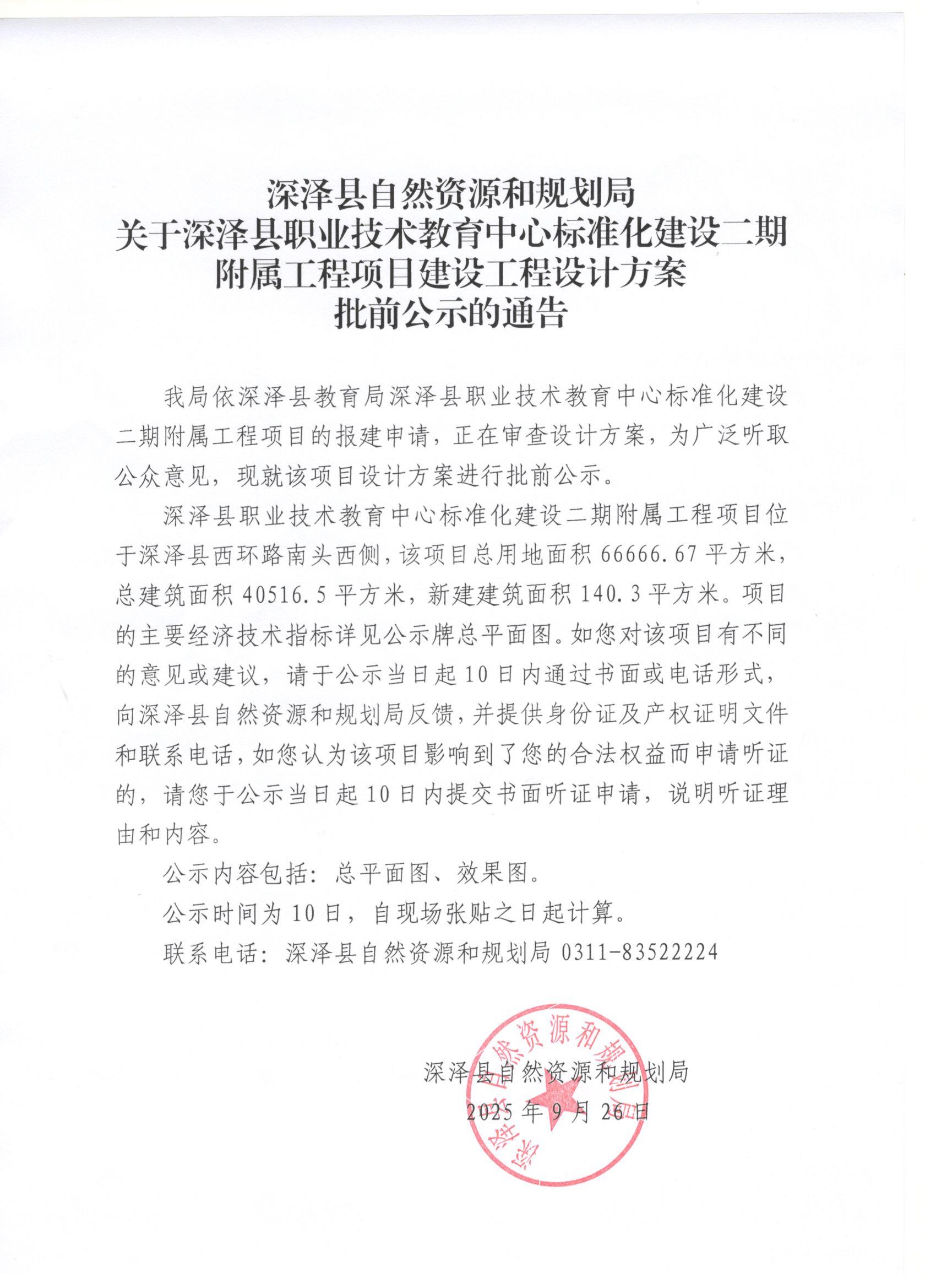 深泽县自然资源和规划局关于深泽县职业技术教育中心标准化建设二期附属工程项目建设工程设计方案批前公示的通告
