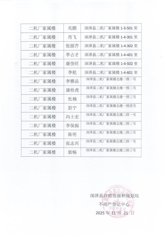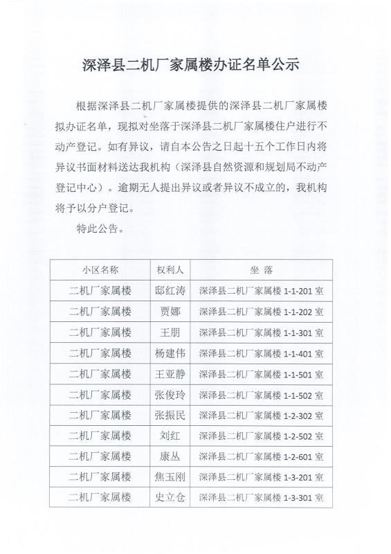 深泽县二机厂(腾飞机械)家属楼办证名单公示