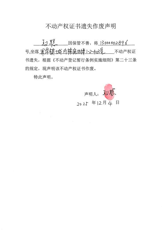 王义聪不动产权证书遗失作废声明