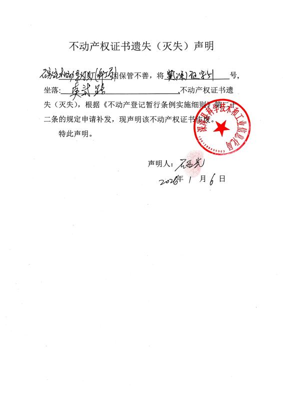 关于石家庄机动车灯具厂(科工局)不动产权证书遗失(灭失)声明