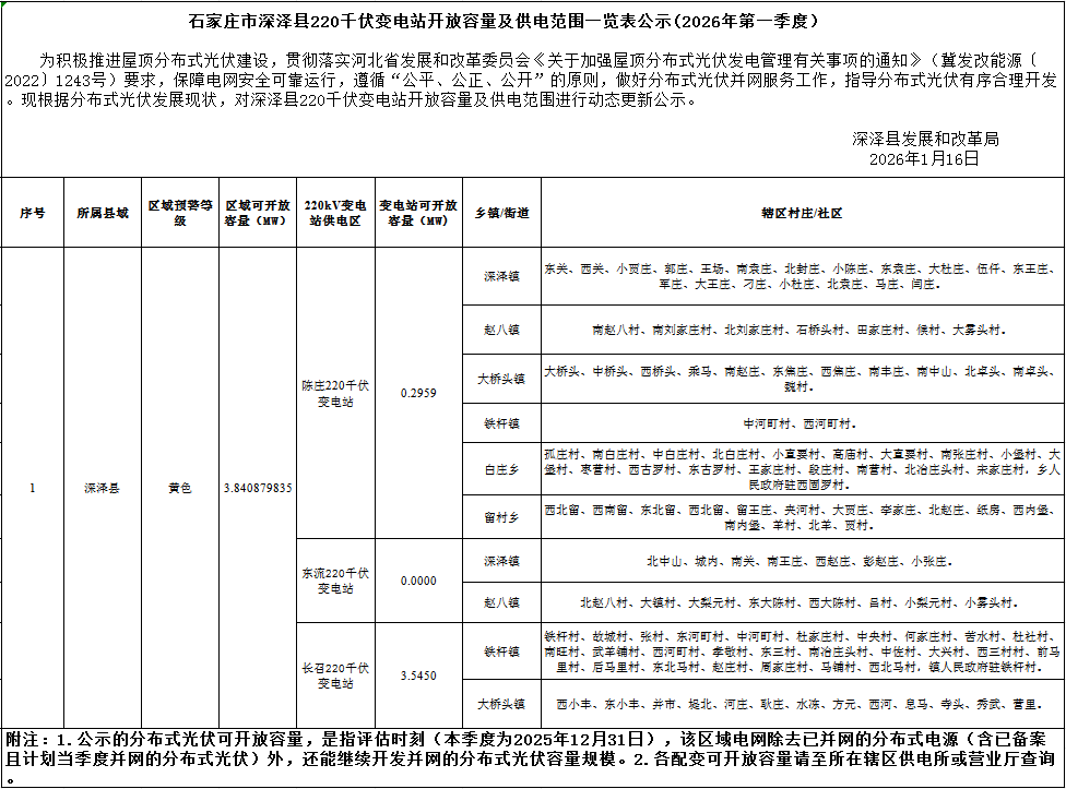 石家庄市深泽县220千伏变电站开放容量及供电范围一览表公示 (2026年第一季度)