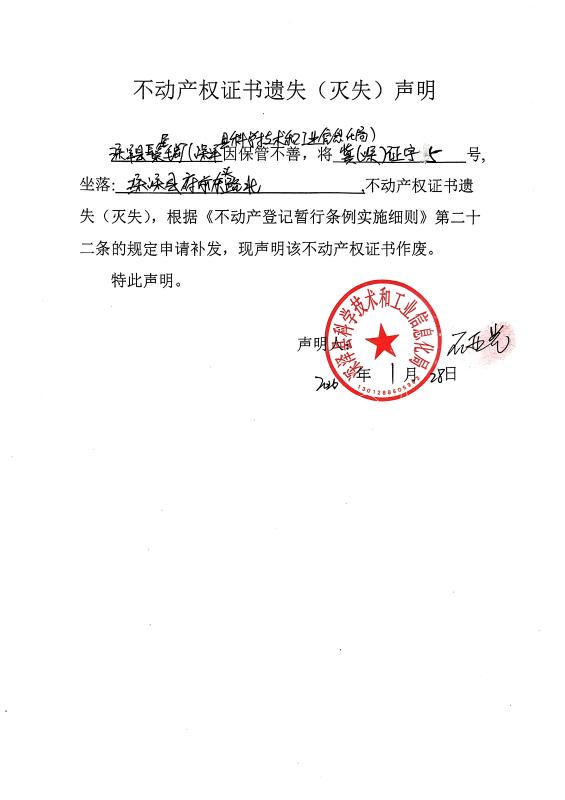 深泽县鬃尾毛总厂(深泽县科学技术和工业信息化局)不动产权证书遗失(灭失)声明