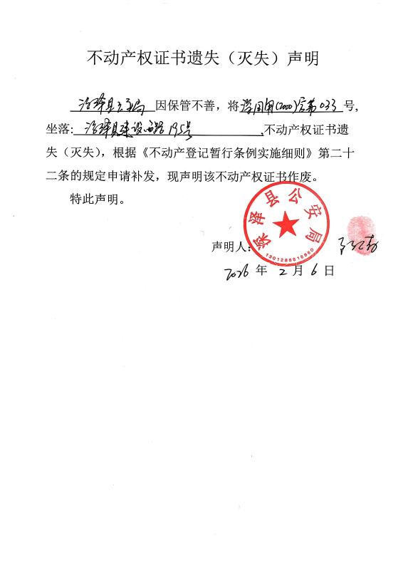 深泽县公安局不动产权证书遗失(灭失)声明