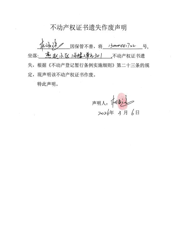关于杜淑瑶不动产权证书遗失作废声明
