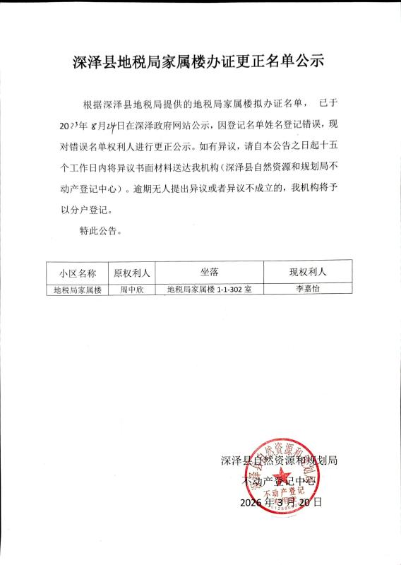 深泽县地方税务局家属楼办证名单公示