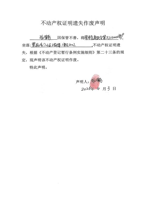 关于张鹤不动产权证明遗失作废声明