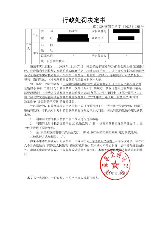 冀0128交罚罚决字〔2025〕285号行政处罚决定书