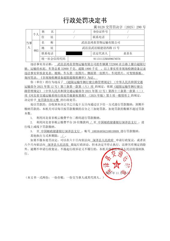 冀0128交罚罚决字〔2025〕290号行政处罚决定书