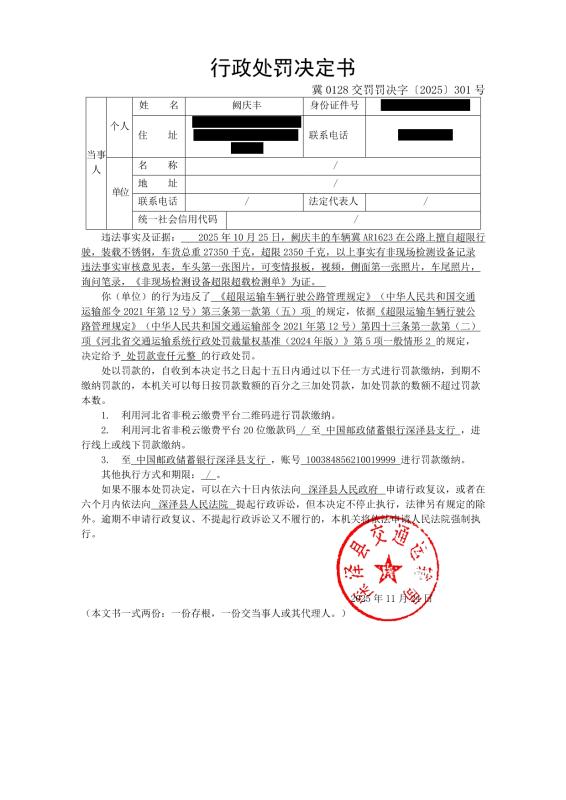 冀0128交罚罚决字〔2025〕301号行政处罚决定书