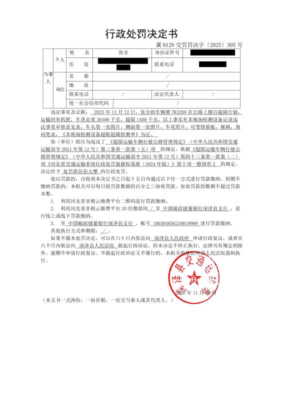 冀0128交罚罚决字〔2025〕305号行政处罚决定书