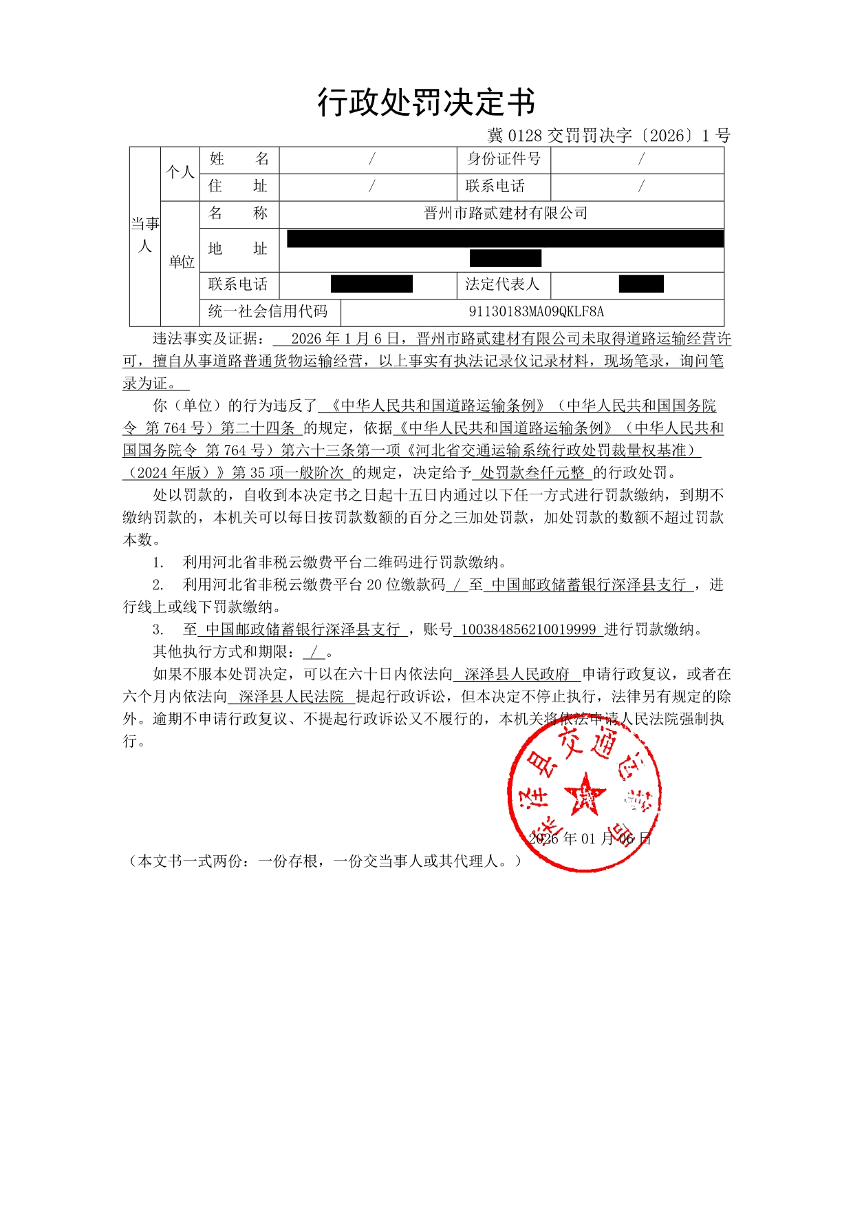 冀0128交罚罚决字〔2026〕1号行政处罚决定书