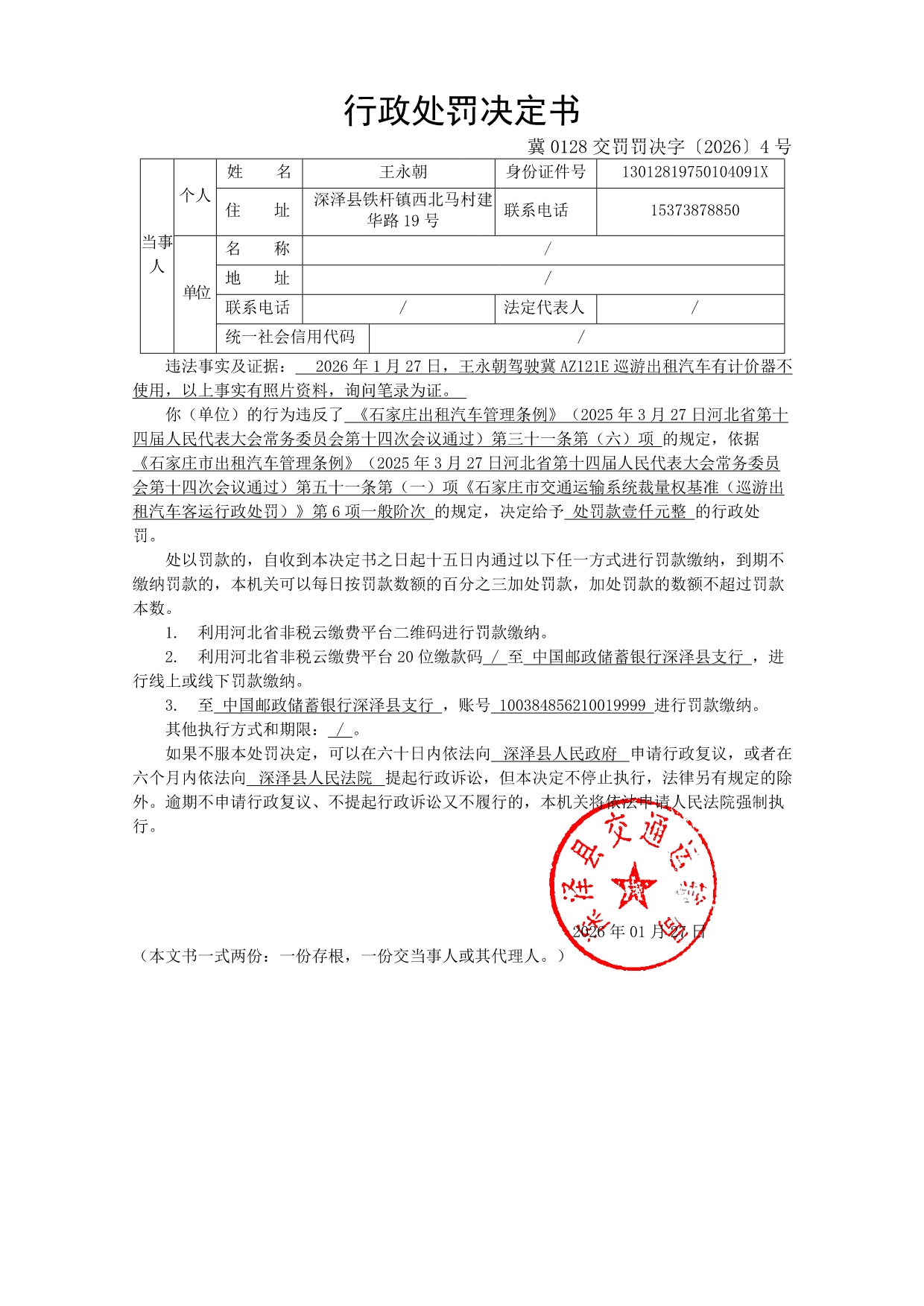 冀0128交罚罚决字〔2026〕4号行政处罚决定书