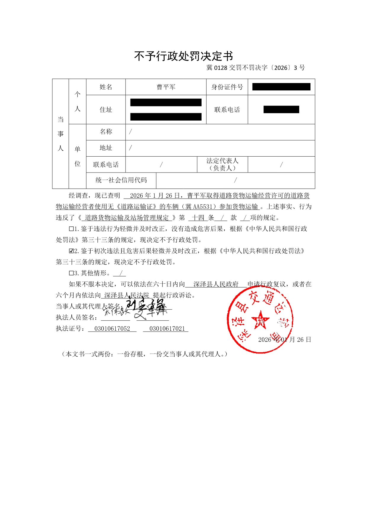 冀0128交罚不罚决字〔2026〕3号不予行政处罚决定书