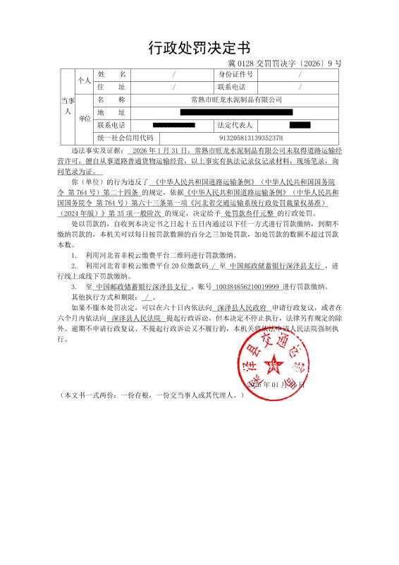 冀0128交罚罚决字〔2026〕9号行政处罚决定书
