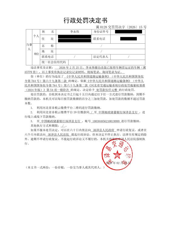 冀0128交罚罚决字〔2026〕15号行政处罚决定书