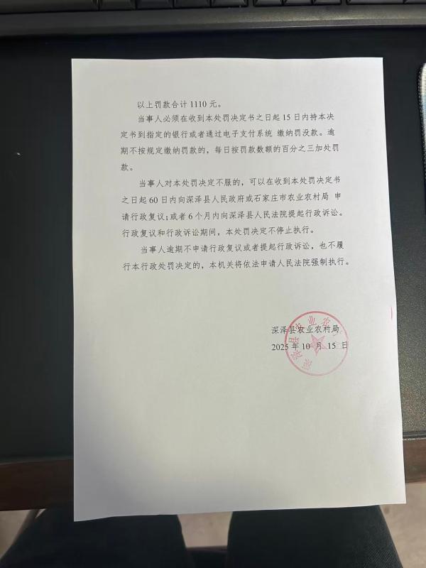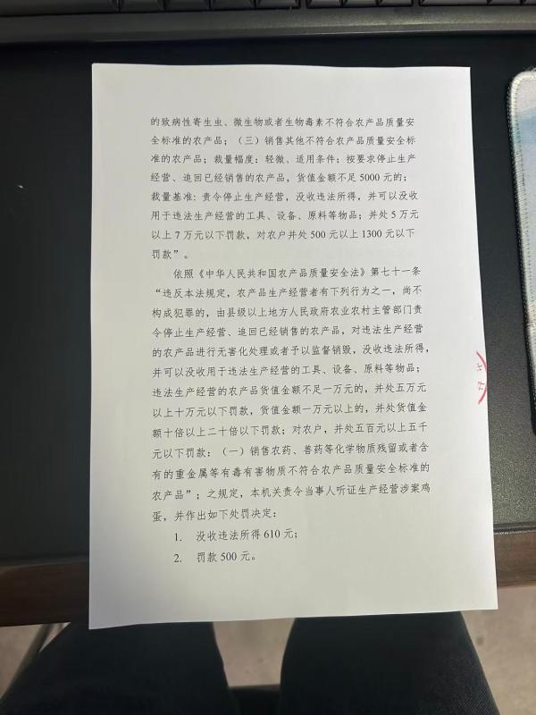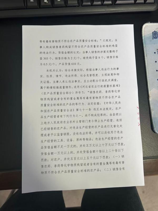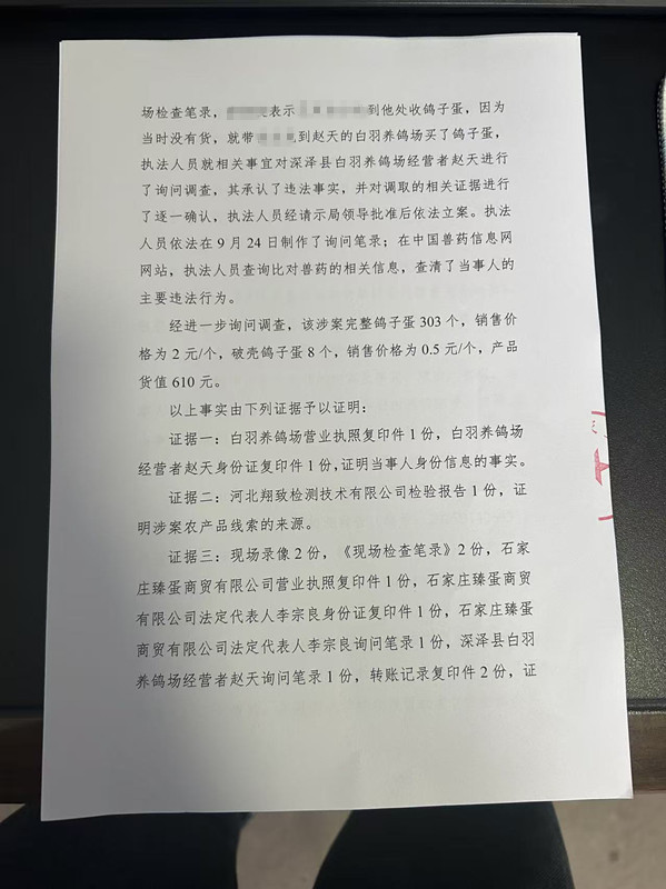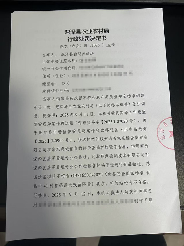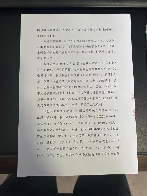 深泽县农业农村局关于《当事人销售兽药残留不符合农产品质量安全标准的鸽子蛋一案》行政处罚决定书
