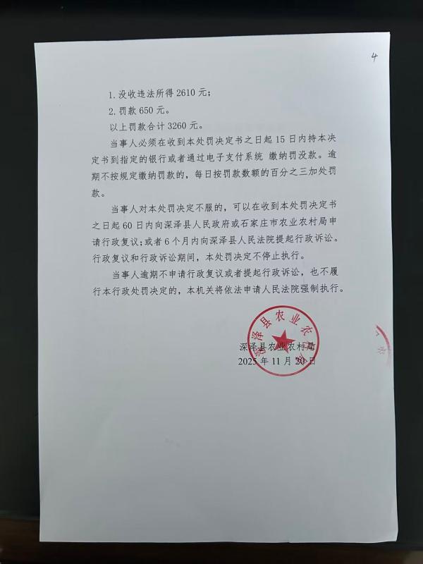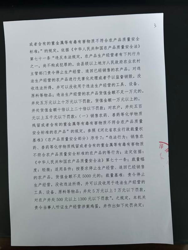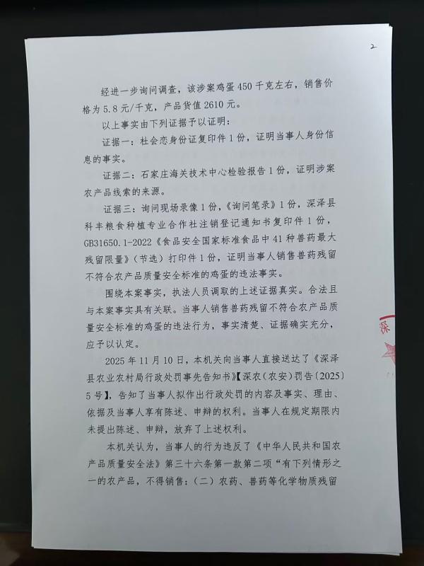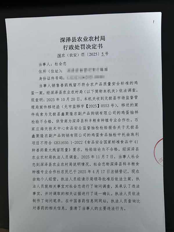 深泽县农业农村局关于《当事人销售兽药残留不符合农产品质量安全标准的鸡蛋一案》行政处罚决定书