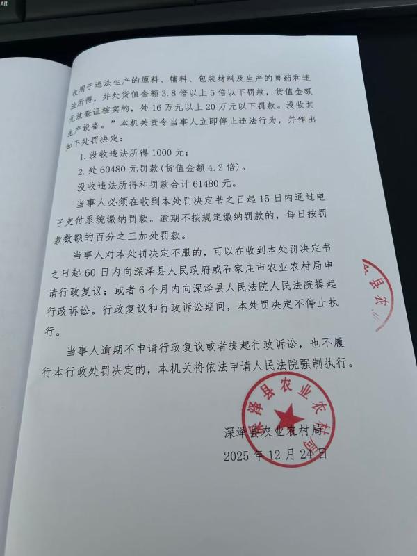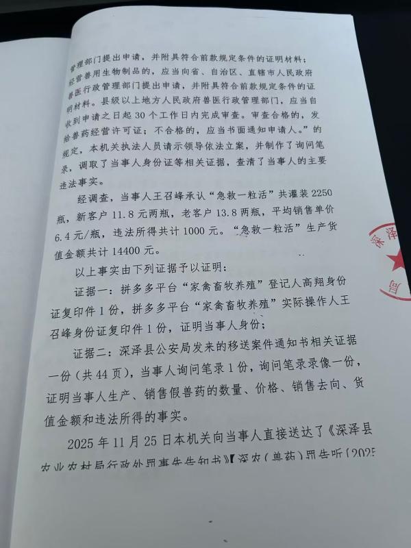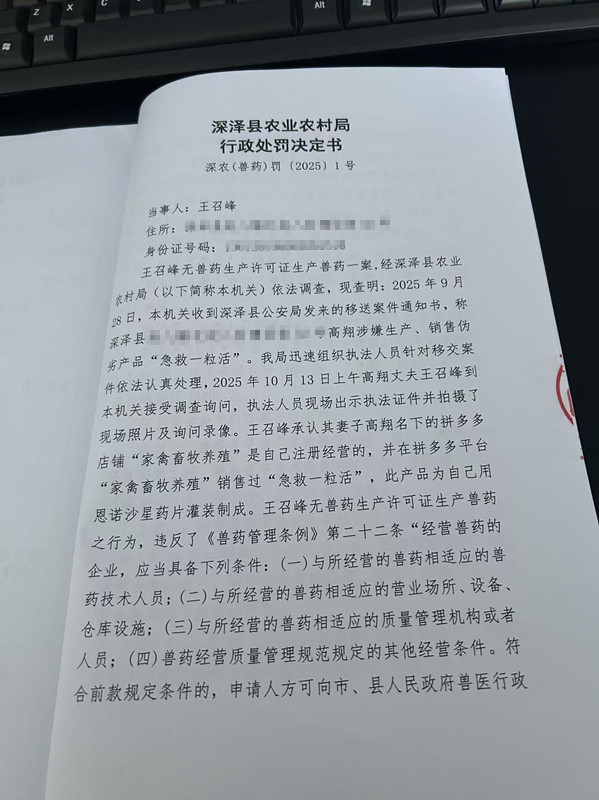 深泽县农业农村局关于《王召峰无兽药生产许可证生产兽药一案》行政处罚决定书