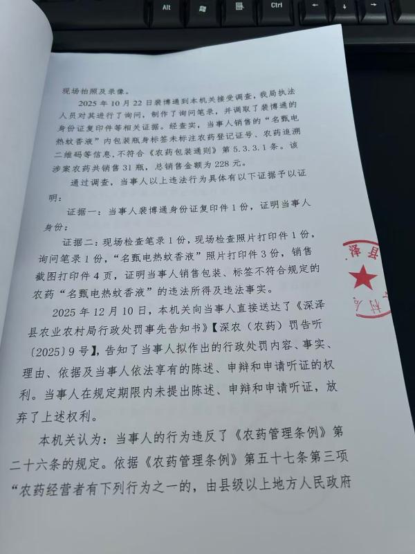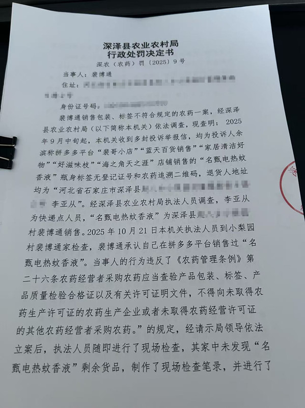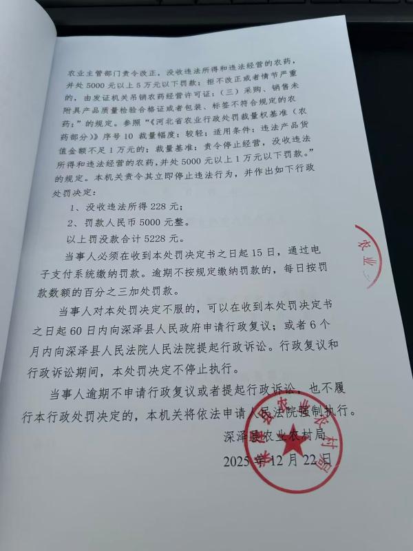 深泽县农业农村局关于《裴博通销售包装、标签不符合规定的农药一案》行政处罚决定书