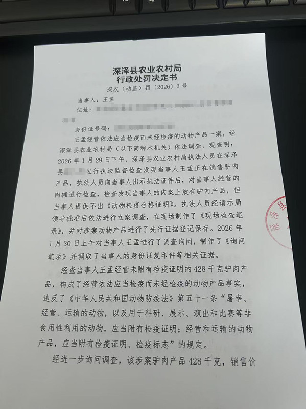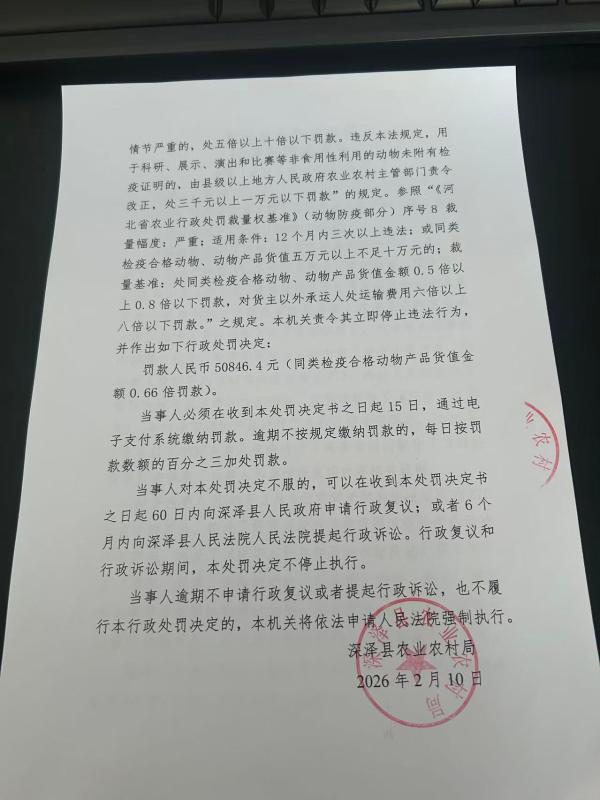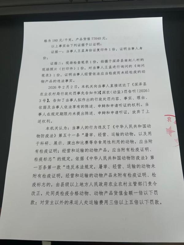 深泽县农业农村局关于《王孟经营依法应当检疫而未经检疫的动物一案》行政处罚决定书