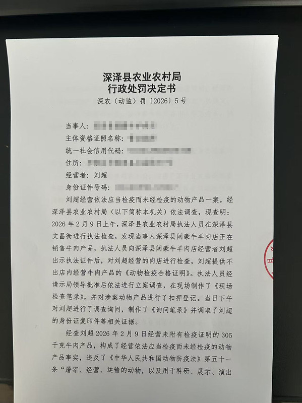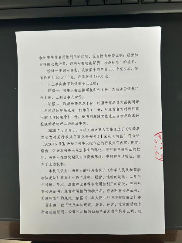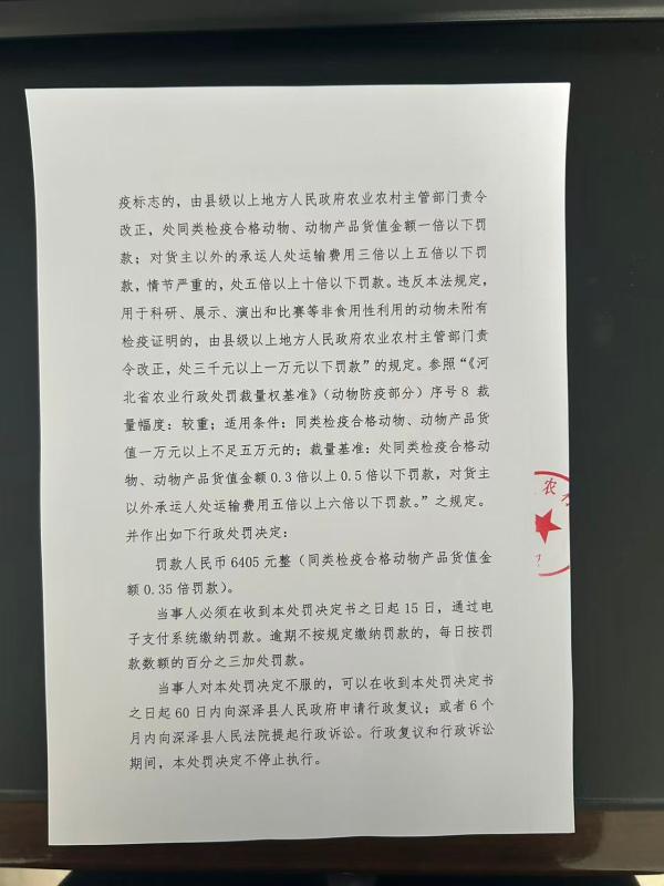 深泽县农业农村局关于《刘超经营依法应当检疫而未经检疫的动物一案》行政处罚决定书